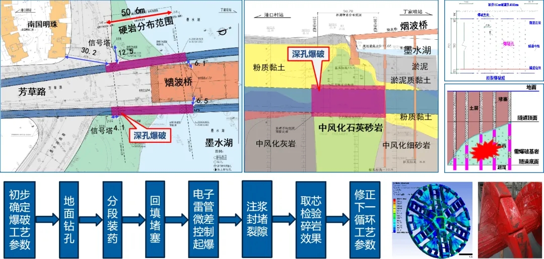 獲獎(jiǎng)項(xiàng)目《地鐵隧道穿越極硬巖的新方法研究》是依托于武漢地鐵12號線港口村站至丁家咀站區(qū)間隧道工程。本項(xiàng)目存在隧道水下穿越強(qiáng)度高達(dá)251MPa極硬巖的復(fù)雜地質(zhì)和周邊有橋梁、建筑等敏感環(huán)境兩大難題,實(shí)驗(yàn)團(tuán)隊(duì)歷經(jīng)近兩年的方案研究和工程實(shí)踐,創(chuàng)新性地提出了解決方案:采用控制爆破技術(shù)對極硬巖進(jìn)行預(yù)處理,有效降低盾構(gòu)機(jī)掘進(jìn)的難度,同時(shí)在爆破過程中采取相應(yīng)的減隔震技術(shù),保障周邊橋梁、房屋和市政管線等建構(gòu)筑物的安全。這一新技術(shù)極大地降低盾構(gòu)機(jī)掘進(jìn)通過極硬巖的難度,提高了施工效率,大幅減少了工程成本,實(shí)現(xiàn)了良好的社會和經(jīng)濟(jì)效益。