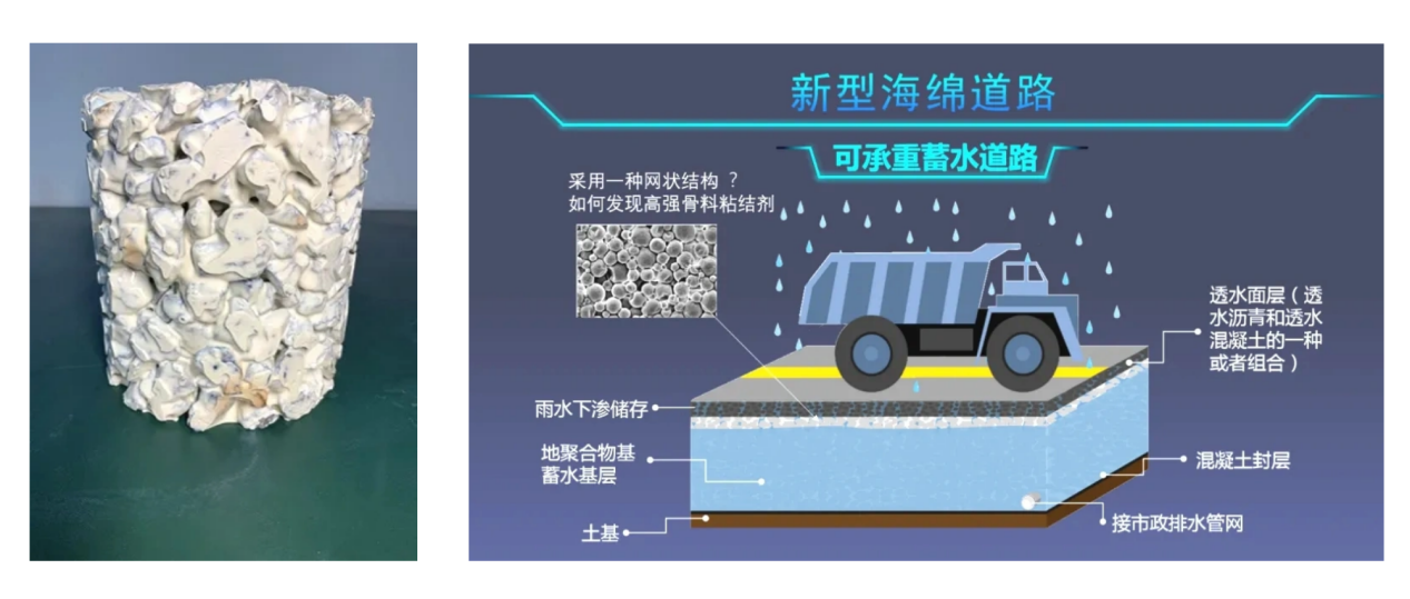 本次獲獎(jiǎng)的《海綿城市可承重蓄水道路材料研發(fā)》科研項(xiàng)目打破了傳統(tǒng)的要求道路基層嚴(yán)格防水的固有思維局限,首次且極具創(chuàng)造性地提出了利用高空隙率的道路基層作為蓄水空間的可承重蓄水道路的新理念。依照這種新的理念,項(xiàng)目團(tuán)隊(duì)制定了嶄新的研究思路并成功開發(fā)出了一種具有高強(qiáng)度、高粘結(jié)特性的新型地聚合物凝膠材料,利用該凝膠材料包覆開級配骨料表面能夠?qū)⒋止橇侠喂痰卣辰Y(jié)在一起,可形成具備高強(qiáng)度和高空隙率的蜂窩狀空間結(jié)構(gòu)凝聚體路基材料,從而能夠在保證路基結(jié)構(gòu)整體強(qiáng)度的同時(shí),實(shí)現(xiàn)高效的道路基層蓄水功能,有利于緩解城市內(nèi)澇,達(dá)到海綿城市可承重蓄水道路建設(shè)的要求,同時(shí)也為大幅提升城市地下空間有效利用率提供了新的可能性。在該項(xiàng)目開展成果評價(jià)時(shí),評價(jià)專家委員會也一致認(rèn)為項(xiàng)目研究成果達(dá)到了國內(nèi)領(lǐng)先水平。