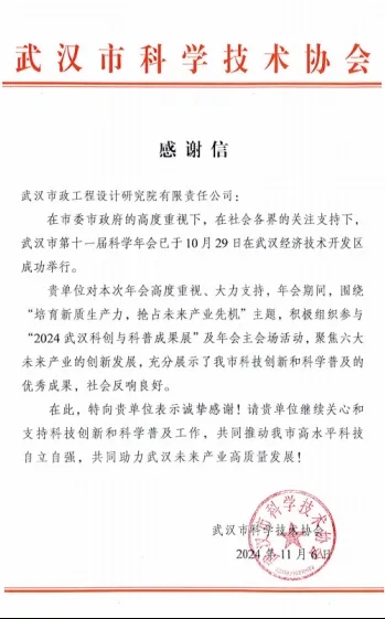 ? ? 在年會(huì)上,武漢市政院展示了近年來(lái)在科技創(chuàng)新和科學(xué)普及方面取得的成果,贏得了武漢市科協(xié)的高度贊譽(yù),特此發(fā)來(lái)感謝信,對(duì)雙方在科技領(lǐng)域的攜手合作予以充分肯定,并期待未來(lái)繼續(xù)并肩前行,共同書(shū)寫(xiě)科技進(jìn)步與城市發(fā)展的新篇章。