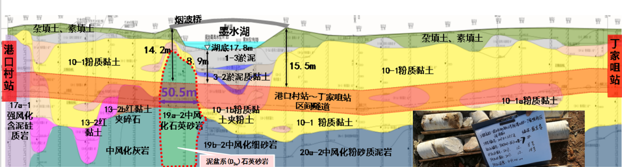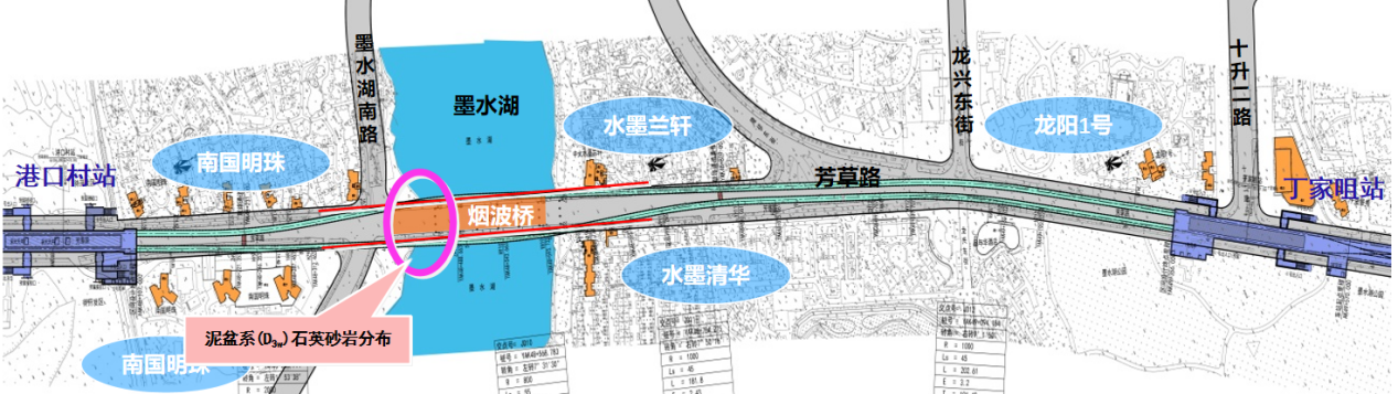 ? ? 超硬巖層、超近下穿。本項(xiàng)目設(shè)計(jì)范圍中的港口村站~丁家咀站區(qū)間隧道長約1242m,采用盾構(gòu)法施工,管片直徑6.2m,需下穿墨水湖與煙波橋,該巖層號(hào)稱“磨刀石”,為武漢地鐵建設(shè)史上的最硬巖層。