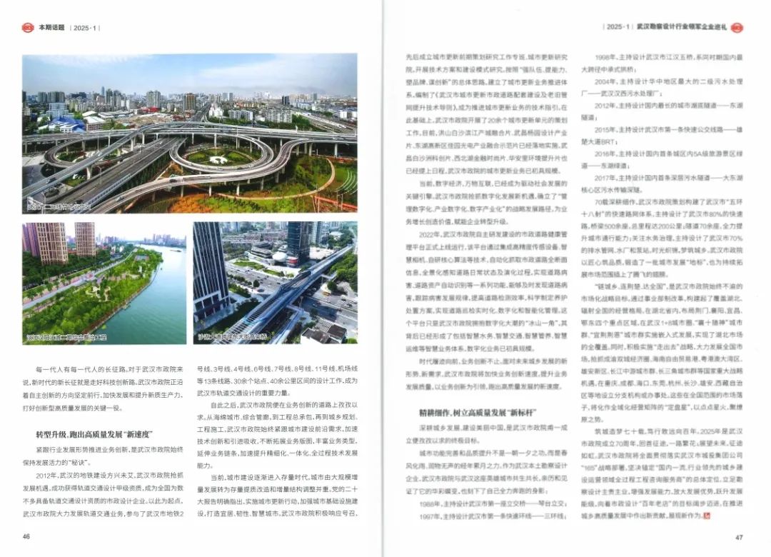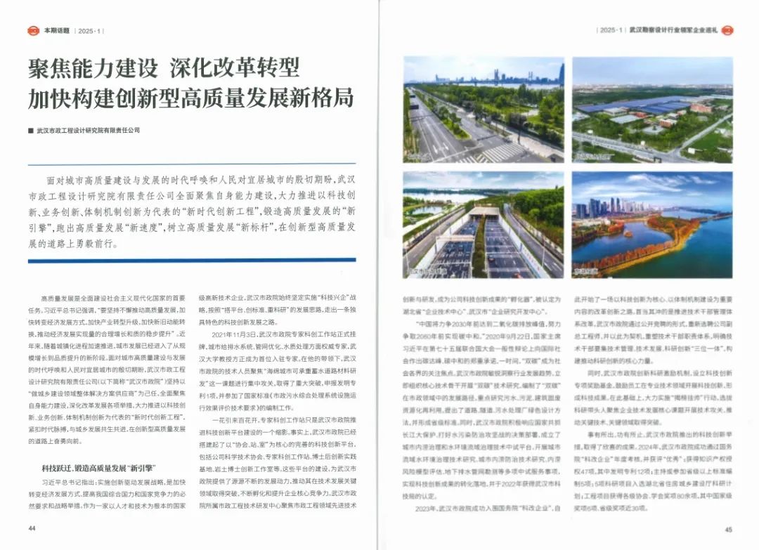 ? ? 近日,行業(yè)權(quán)威期刊《中國(guó)勘察設(shè)計(jì)》聚焦武漢勘察設(shè)計(jì)行業(yè),對(duì)領(lǐng)軍企業(yè)進(jìn)行了專(zhuān)題報(bào)道。其中,武漢市政工程設(shè)計(jì)研究院有限責(zé)任公司(以下簡(jiǎn)稱(chēng)“武漢市政院”)以“聚焦能力建設(shè),深化改革轉(zhuǎn)型,加快構(gòu)建創(chuàng)新型高質(zhì)量發(fā)展新格局”為主題,分享了其在新時(shí)代背景下的創(chuàng)新實(shí)踐和發(fā)展成果,展示了企業(yè)在高質(zhì)量發(fā)展道路上勇毅前行的風(fēng)采和活力,引發(fā)了行業(yè)廣泛關(guān)注。