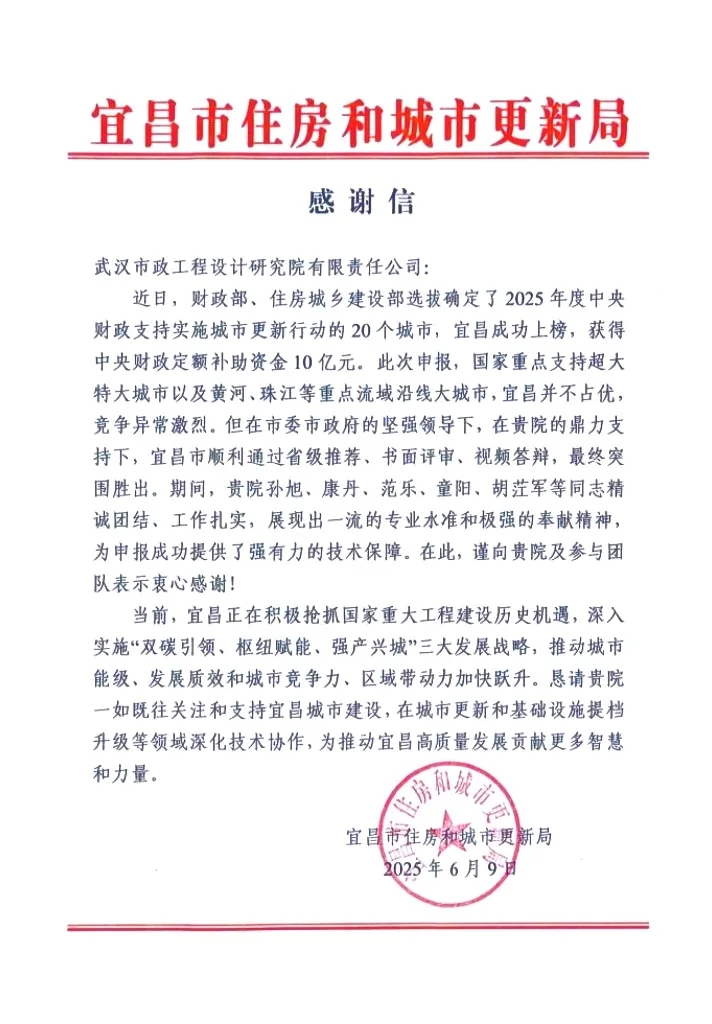2025年6月4日,國家財(cái)政部經(jīng)濟(jì)建設(shè)司與住房城鄉(xiāng)建設(shè)部城市建設(shè)司聯(lián)合發(fā)布《2025年度中央財(cái)政支持實(shí)施城市更新行動(dòng)評(píng)選結(jié)果公示》,湖北省宜昌市成功入圍。武漢市政院作為唯一技術(shù)支持單位助力宜昌成功入選國家支持城市名單,充分彰顯了公司作為城鄉(xiāng)建設(shè)運(yùn)營全過程咨詢智庫的卓越技術(shù)實(shí)力。