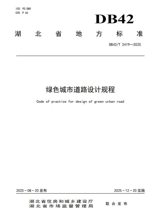 ? ? 近日,由武漢市政院主持編制的湖北省《綠色城市道路設(shè)計規(guī)程》(DB42/T 2419-2025)地方標(biāo)準(zhǔn),經(jīng)湖北省住房和城鄉(xiāng)建設(shè)廳、湖北省市場監(jiān)督管理局聯(lián)合批準(zhǔn)發(fā)布,將于2025年12月20日起正式實施。該標(biāo)準(zhǔn)是公司聯(lián)合行業(yè)多家單位,歷時三年深入調(diào)研國內(nèi)典型城市綠色道路建設(shè)實踐,系統(tǒng)總結(jié)湖北省實踐經(jīng)驗的重要成果。