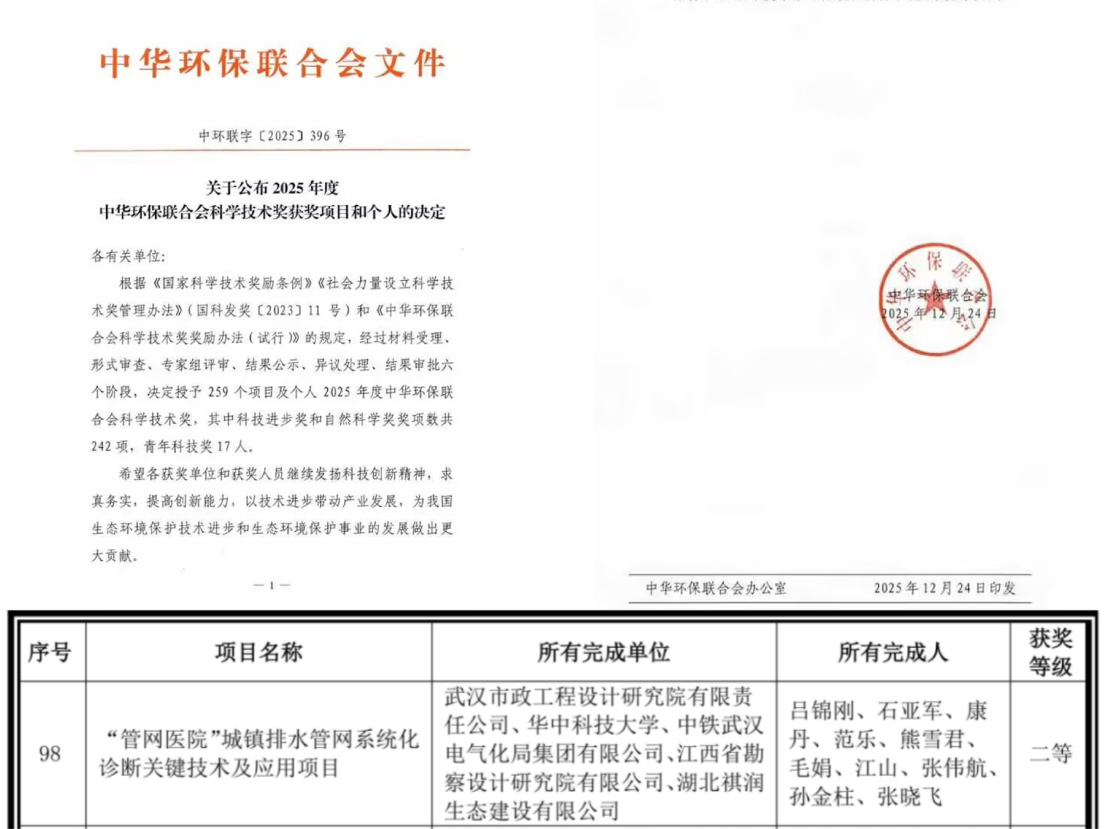 ? ? 近日,武漢市政院自主研發(fā)的“‘管網(wǎng)醫(yī)院’城鎮(zhèn)排水管網(wǎng)系統(tǒng)化診斷關(guān)鍵技術(shù)及應(yīng)用研究”,經(jīng)中華環(huán)保聯(lián)合會(huì)在北京組織技術(shù)成果評(píng)價(jià)會(huì)議評(píng)審,順利通過(guò)科技成果評(píng)價(jià),被認(rèn)定為達(dá)到“國(guó)際先進(jìn)水平”,并榮獲“2025年中華環(huán)保聯(lián)合會(huì)科技進(jìn)步獎(jiǎng)二等獎(jiǎng)”。