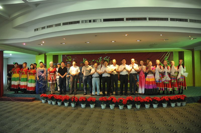 在莊嚴的《國際歌》中,總結(jié)表彰大會結(jié)束,一臺由公司黨員和入黨積極分子自編、自演的文藝演出正式開始,《再唱山歌給黨聽》、《長征》、《情深誼長》等精彩的歌舞節(jié)目贏得了觀眾的陣陣掌聲,演出現(xiàn)場洋溢著歡樂、喜慶的氣氛。演出最后,各位領(lǐng)導(dǎo)走到臺上,與全體演員和觀眾一起高唱《沒有共產(chǎn)黨就沒有新中國》,臺上臺下感情交匯,將現(xiàn)場氣氛推向高潮。