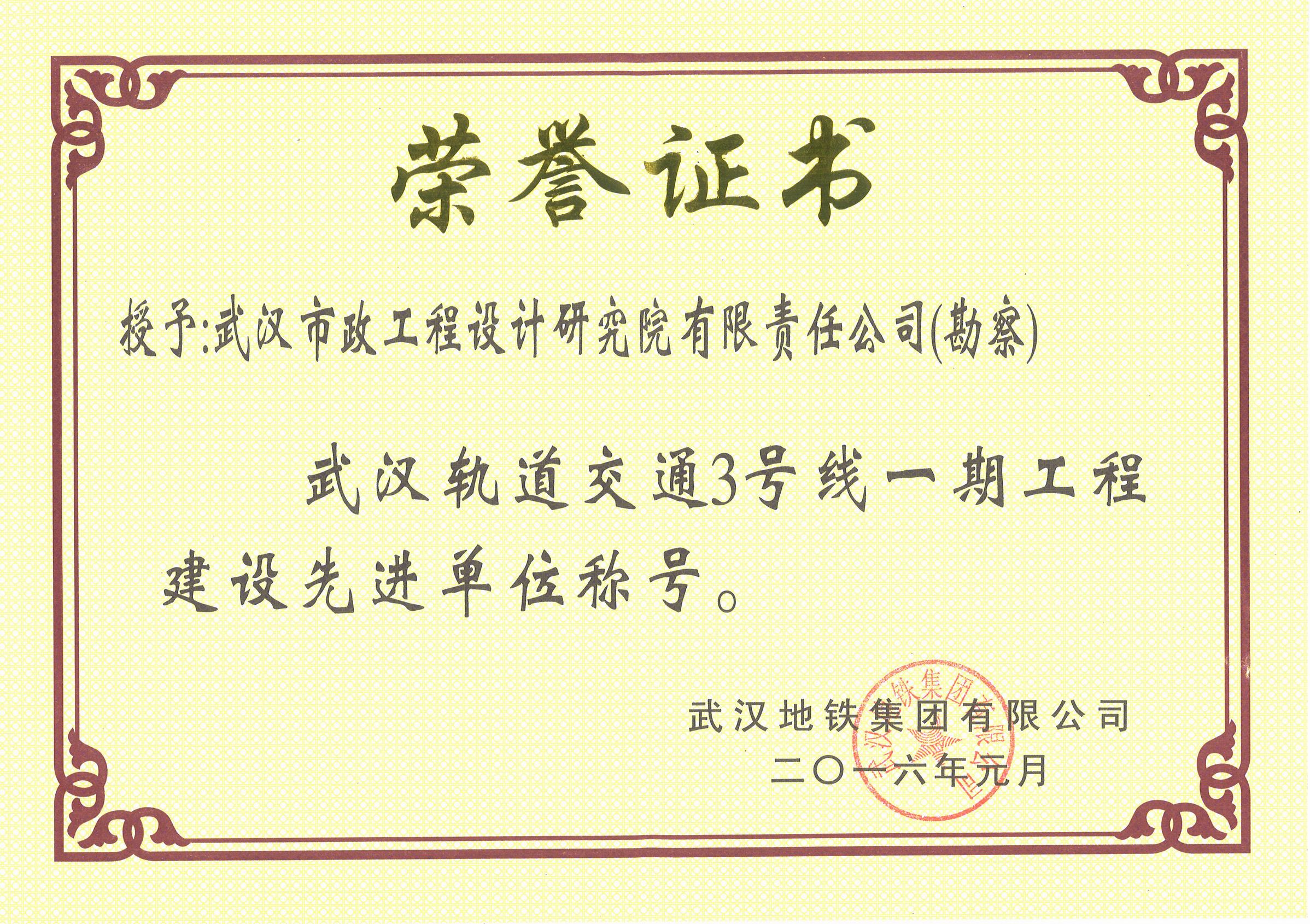 公司榮獲“武漢市軌道交通三號(hào)線工程建設(shè)先進(jìn)單位”榮譽(yù)稱號(hào)