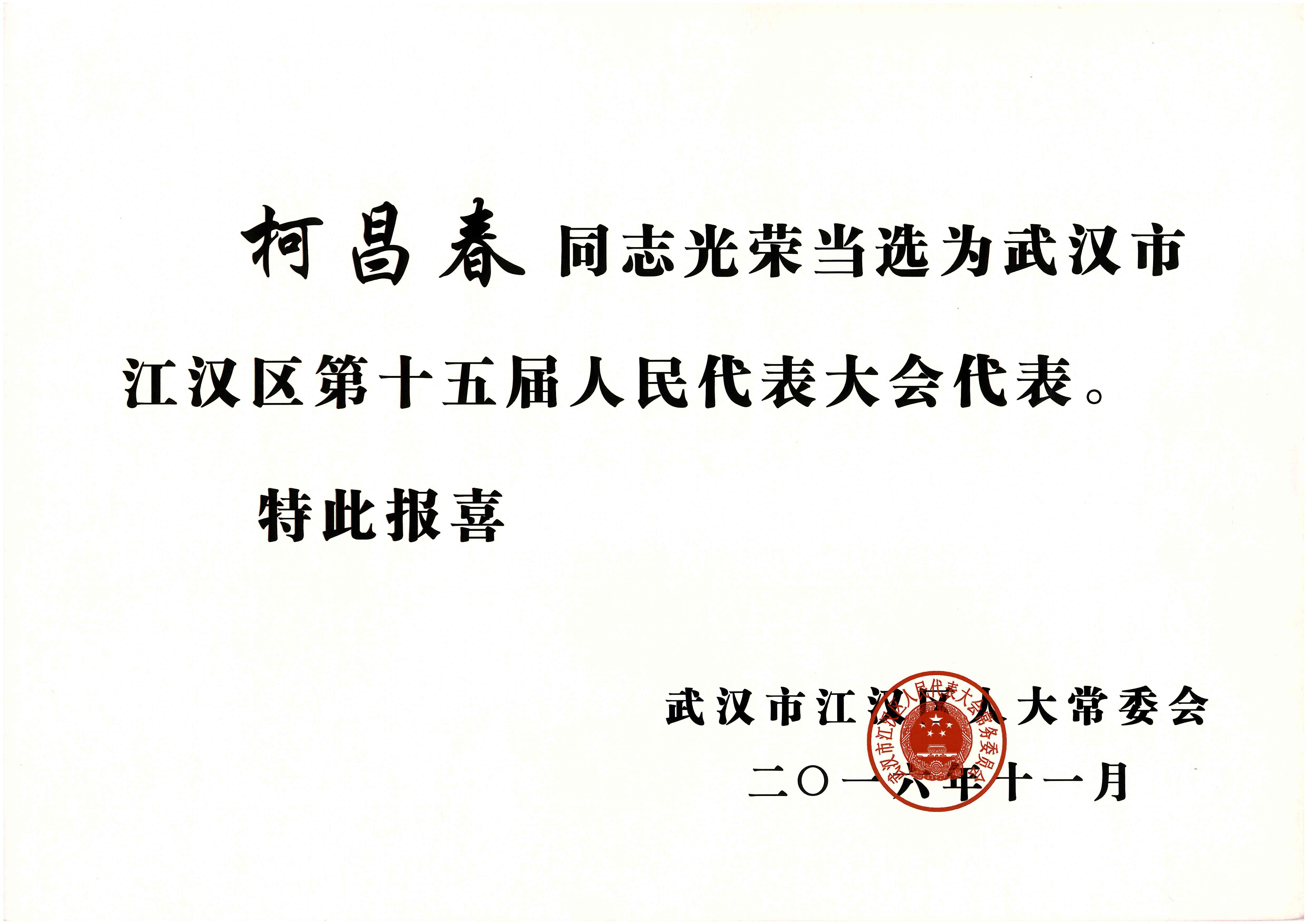 ??? 11月10日,江漢區(qū)進(jìn)行了人大代表選舉,依法選舉產(chǎn)生了第十五屆人民代表大會代表,后經(jīng)江漢區(qū)人大常委會確認(rèn),公司董事長柯昌春同志光榮當(dāng)選為江漢區(qū)第十五屆人民代表大會代表。這也是他連續(xù)第二次當(dāng)選為江漢區(qū)人大代表。