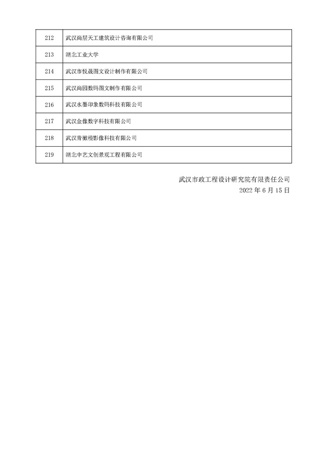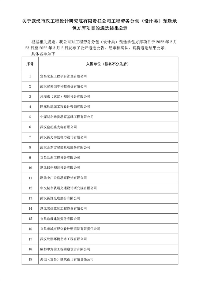 關(guān)于武漢市政工程設(shè)計(jì)研究院有限責(zé)任公司工程勞務(wù)分包(設(shè)計(jì)類)預(yù)選承包方庫項(xiàng)目的遴選結(jié)果公示