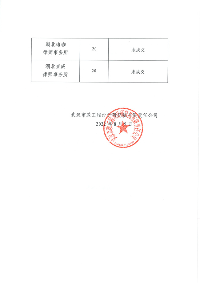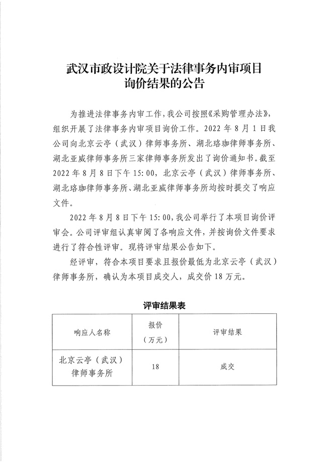 武漢市政設(shè)計院關(guān)于法律事務(wù)內(nèi)審項目詢價結(jié)果的公告