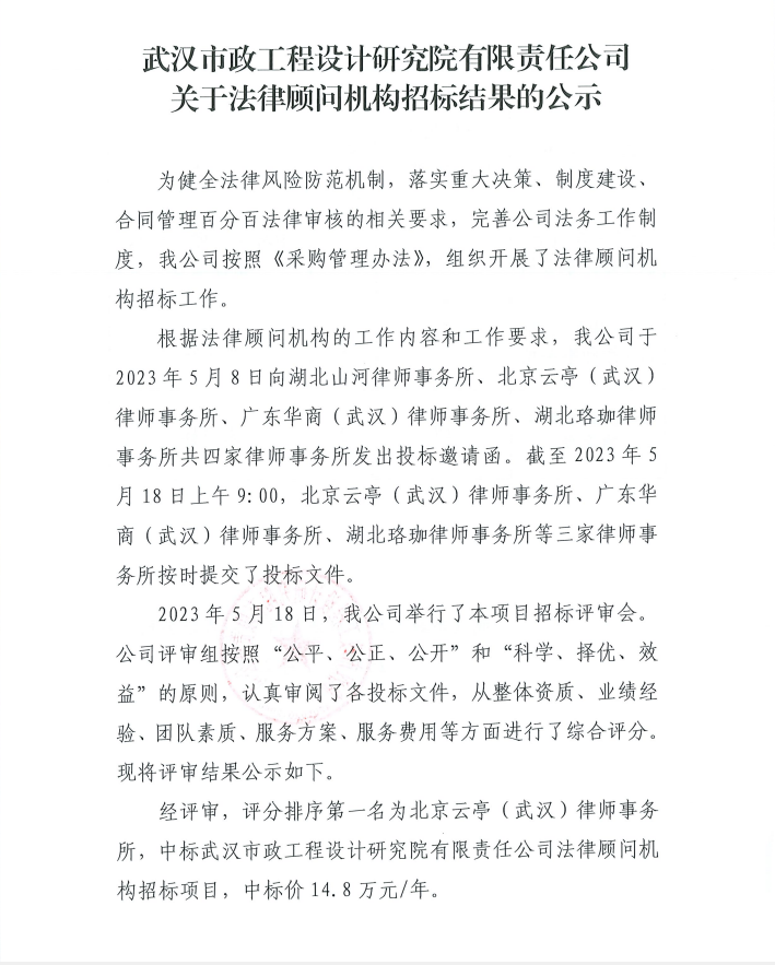 武漢市政工程設(shè)計(jì)研究院有限責(zé)任公司關(guān)于法律顧問(wèn)機(jī)構(gòu)招標(biāo)結(jié)果的公示
